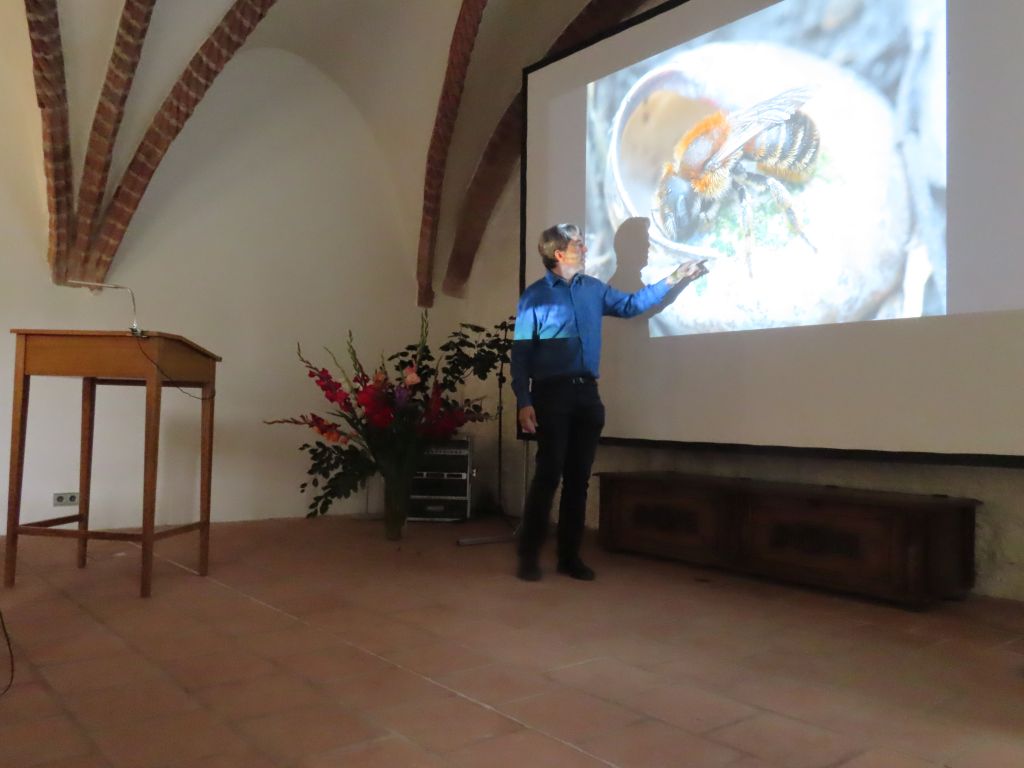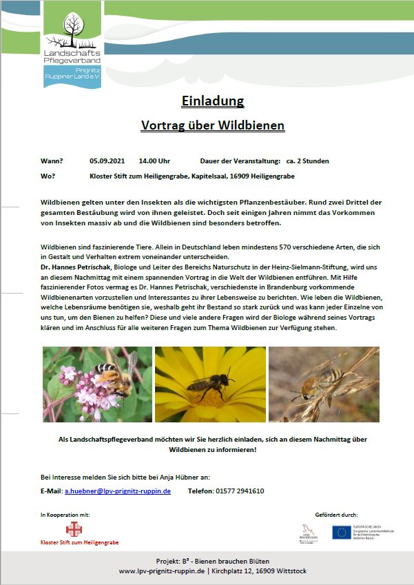 Am 05. September 2021 lud der LPV Prignitz-Ruppiner Land e.V. zu einer Informationsveranstaltung zum Thema Wildbienen in das Kloster Stift zum Heiligengrabe ein. Dr. Hannes Petrischak, Biologe und Leiter des Bereichs Naturschutz in der Heinz Sielmann Stiftung, entführte die Teilnehmer*innen der Veranstaltung mit einem spannenden Vortrag in die Welt der Wildbienen. Mithilfe faszinierender Fotos vermochte es Dr. Hannes Petrischak, verschiedenste in Brandenburg vorkommende Wildbienenarten vorzustellen und Interessantes zu ihrer Lebensweise zu berichten. Wie leben die Wildbienen, welche Lebensräume benötigen sie, weshalb geht ihr Bestand so stark zurück und was kann jede*r Einzelne von uns tun, um den Bienen zu helfen? Diese und viele weitere Fragen der Teilnehmenden konnte der Biologe an diesem Nachmittag klären.